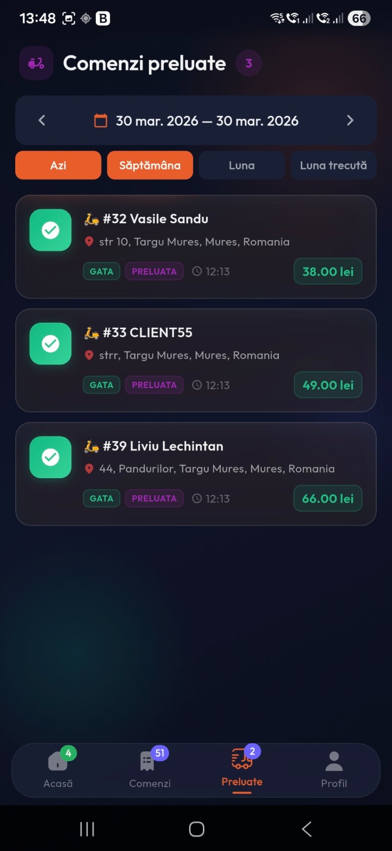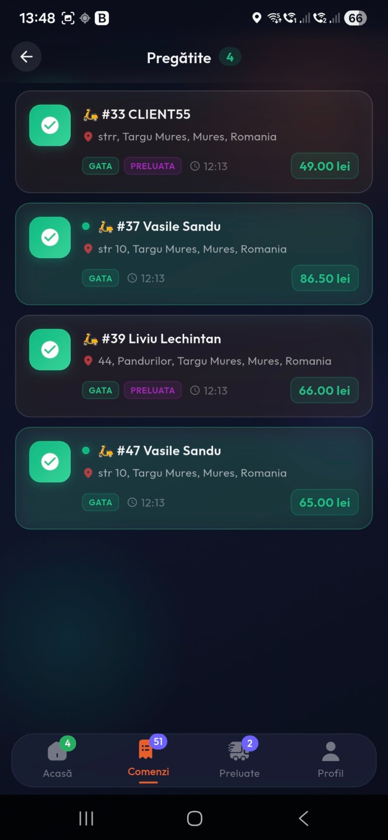 Livratorul vede toate comenzile alocate lui — active, preluate și finalizate. Cu un singur tap, marchează o comandă ca preluată sau finalizată.