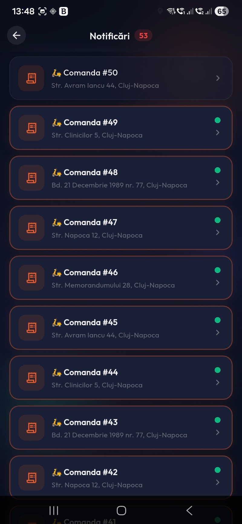 Fiecare comandă nouă trimite alertă push pe telefonul livratorului, chiar dacă aplicația este în fundal.